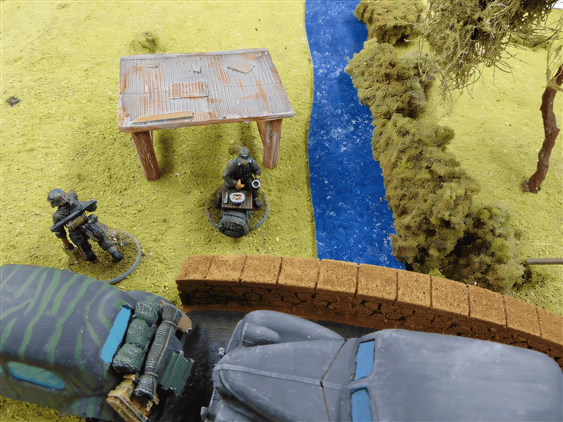 The ‘IN ACTION’ images of this model are included here in order to give you some ideas for setting the scene on your own model railway or wargaming table. Many of the other items in the photographs are also produced by me and are available here from this site. The majority of the painting and detailing work was done using mainly acrylic paints due to their fast drying time. The process is to wash the resin model in warm soapy water to remove any traces of the silicone mould release agent. This will aid good paint adhesion. Next I recommend a primer, but I don’t bother unless the model will be subject to a lot of handling. After applying the main colours I then use a dark wash to increase the contrast and once dry a quick ‘dry brush’ with a lighter shade to pick up the raised details. Finally a spray or brush matt varnish for protection."- Stuart
