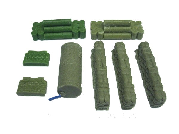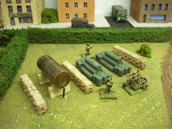 1:72 for OO or 20mm. An assortment of 6 items for creating petrol dumps. 2 stacked loads of 44 gal drums, 3 sandbag walls and a storage tank.
