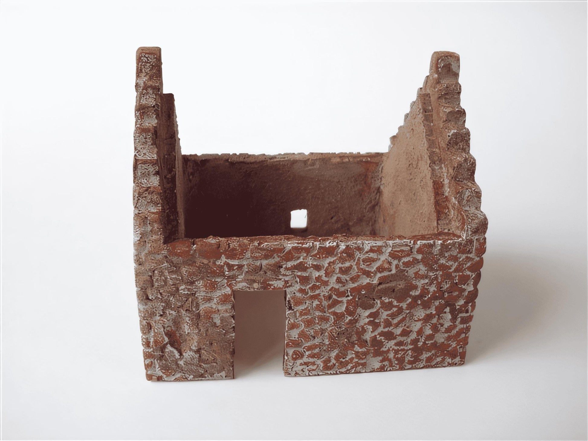 4mm/1:76 scale. A small stone built building with crow step gables. The roof is long gone and the building is slowly decaying. Add it to a lonely hillside or farm scene for some added atmosphere.