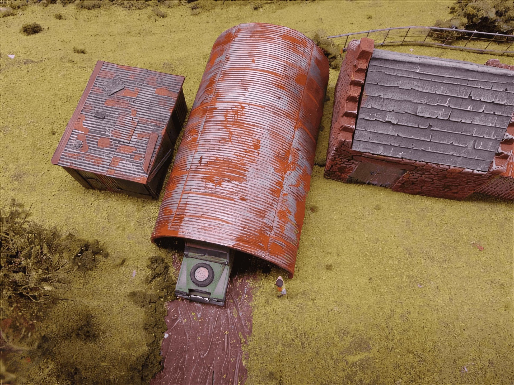 4mm/1:76 scale for OO railways or 20mm wargames. A single piece hollow resin casting of a small rusty Nissan hut without gable ends now used as a farm or industrial building.