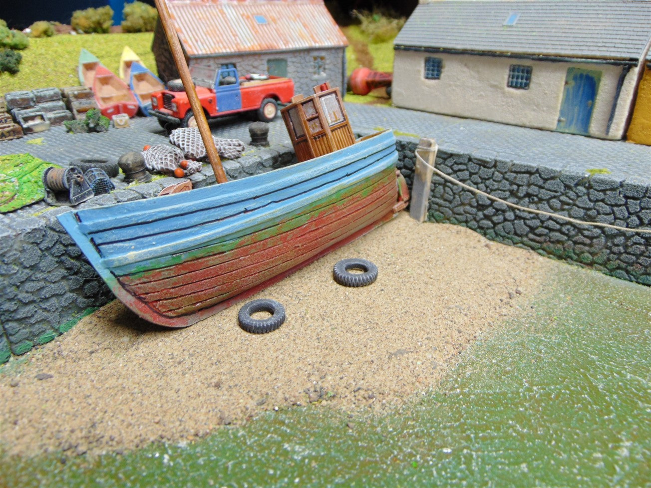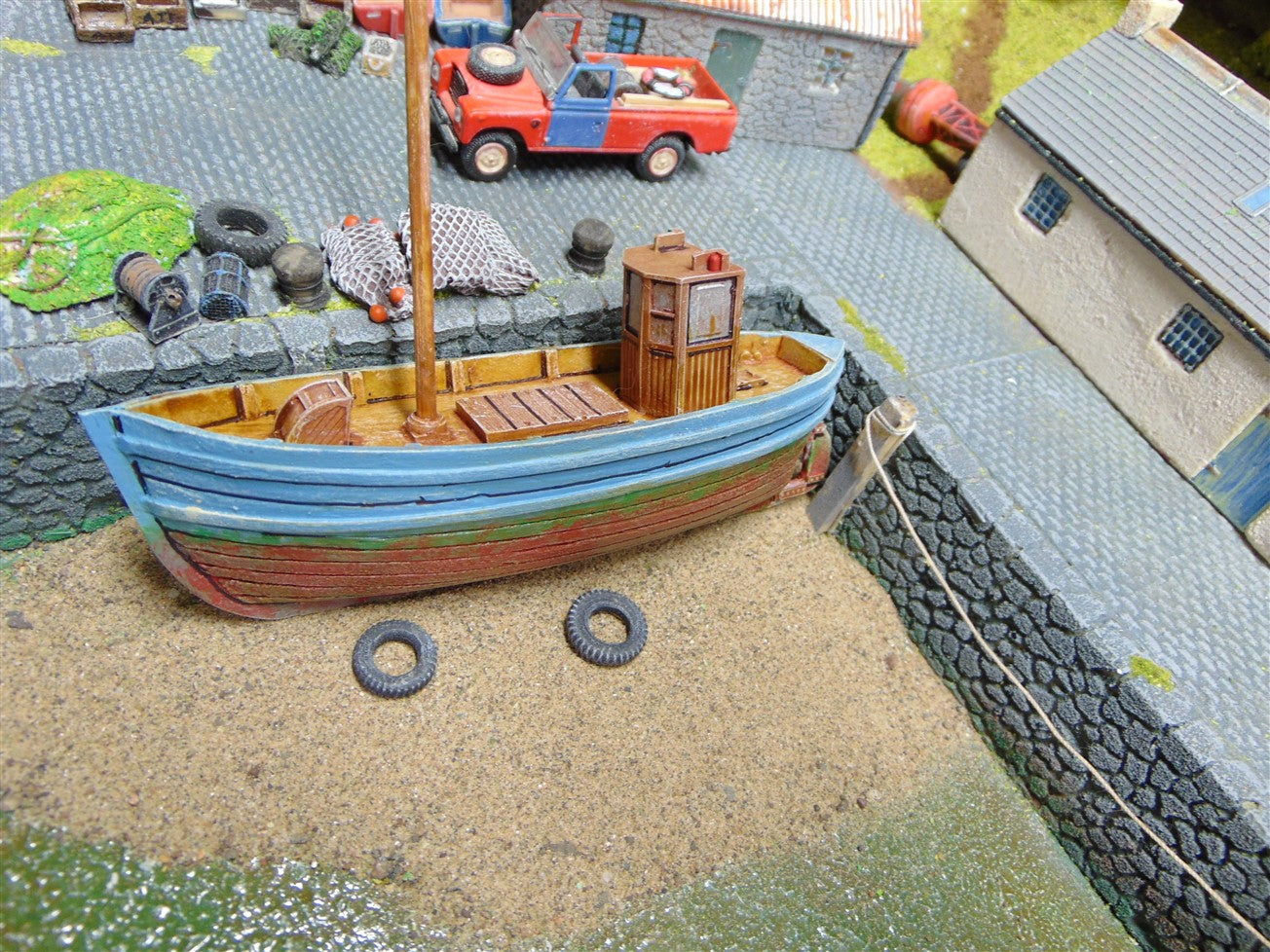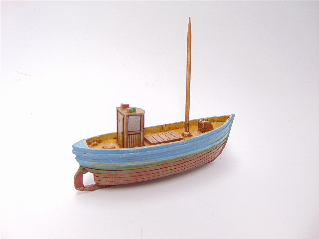 4mm/1:76 for OO or 20mm Small Scottish type motor fishing vessel with wheelhouse for 1 man and awaiting the refitting of prop. This version is full hulled so it can be used on a boatyard slipway or in a low tide harbour scene.