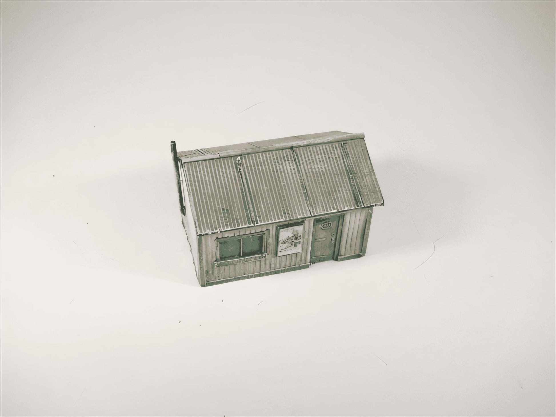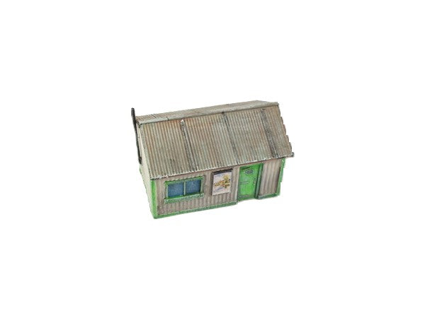 4mm/1:76 scale for OO railways or 20mm wargames. A 2 piece hollow resin casting of a small sheet metal clad building suitable as a small ticket office or platform waiting room. Ideal on a narrow gauge railway. Roof is removable.