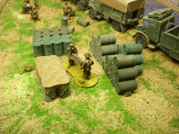 1:48 scale for 32 mm figures. 9-piece set of 44-gallon oil drums for larger size figures.