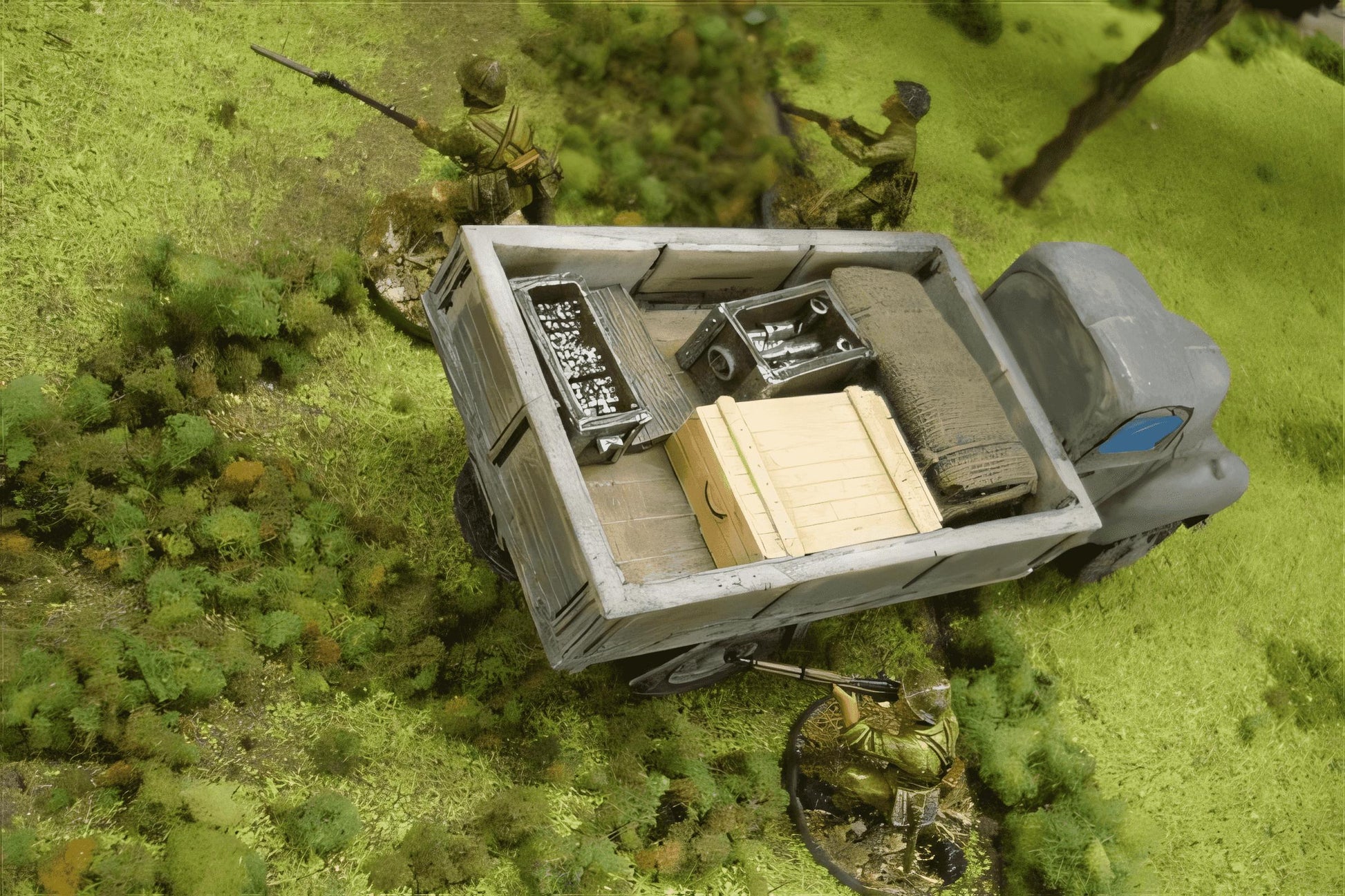 "To achieve this look for the American truck from the 1940s, I started with a base coat of dark grey primer to ensure the subsequent layers of paint adhered well to the resin. I then applied a lighter grey to simulate wear and simulate the metal bodywork of that era's vehicles. For the windows, a mix of light blue and white gave them a reflective quality. The wooden bed was painted in a brown basecoat with lighter brown dry brushing to highlight the texture, mimicking woodgrain effectively. To represent the canvas cover, I applied a tan colour and used a darker shade for shading to create the impression of folds. For added realism, I applied a black wash to the entire model, which settled into the recessed details, accentuating them and giving the vehicle an authentically aged look. Lastly, I dry brushed with a light grey to bring out the edges and details." - Stuart