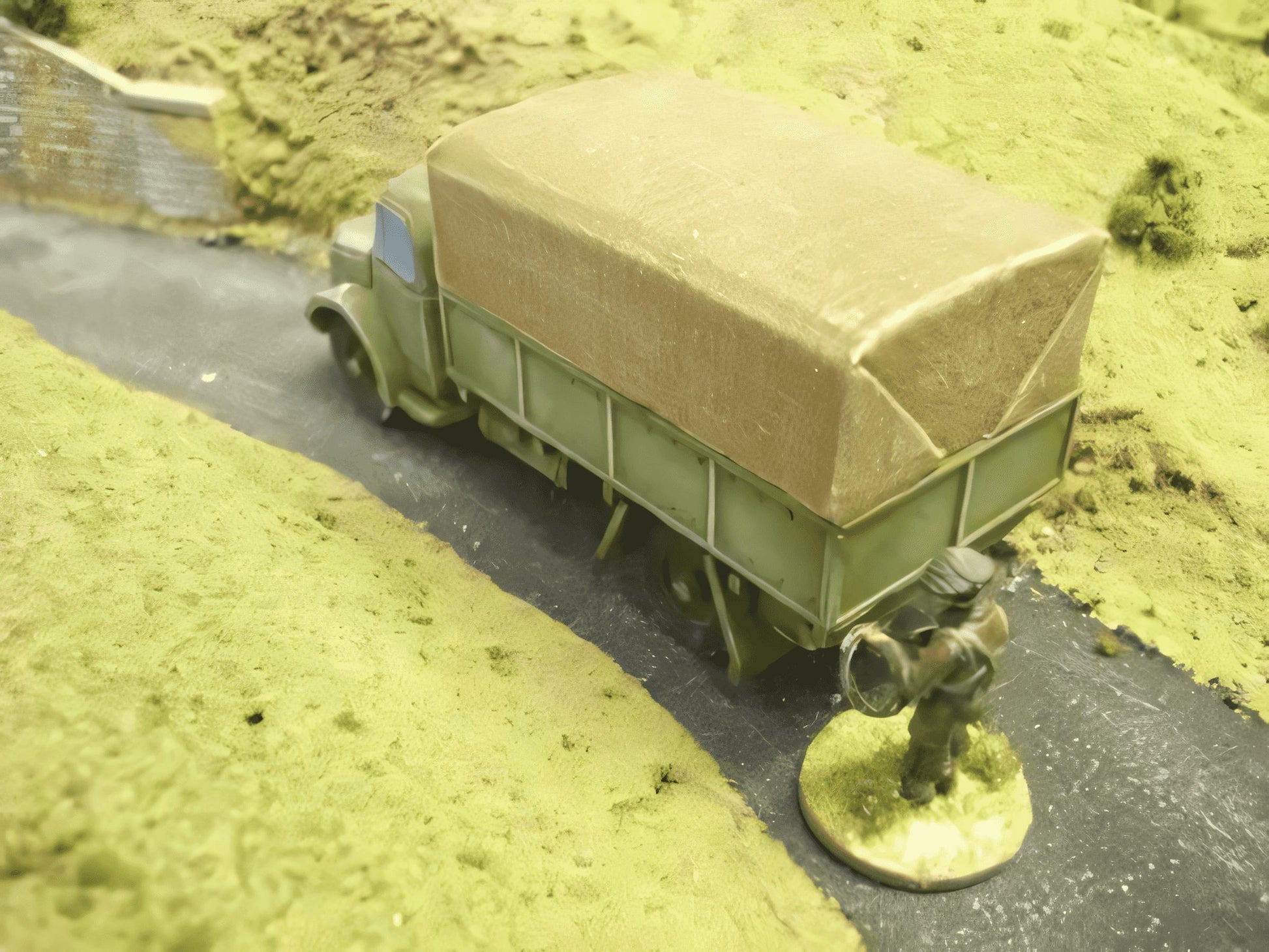 "To achieve a similar result with the Bedford OYD model, I started by priming the surface with a suitable primer to ensure good paint adhesion. I then applied a base coat in olive drab, carefully following the vehicle's lines to maintain its contours. With the base coat dry, I added depth through a combination of washes and dry brushing to bring out the details, making sure to accentuate the raised features. Subtle highlighting was applied to the edges to enhance the dimensionality. The canopy was treated with a textured paint to replicate the canvas, and the windows were given a reflective look with a gloss varnish. This process, done with patience and care, allowed me to achieve a finished item with a well-worn look fitting for the era." - Stuart