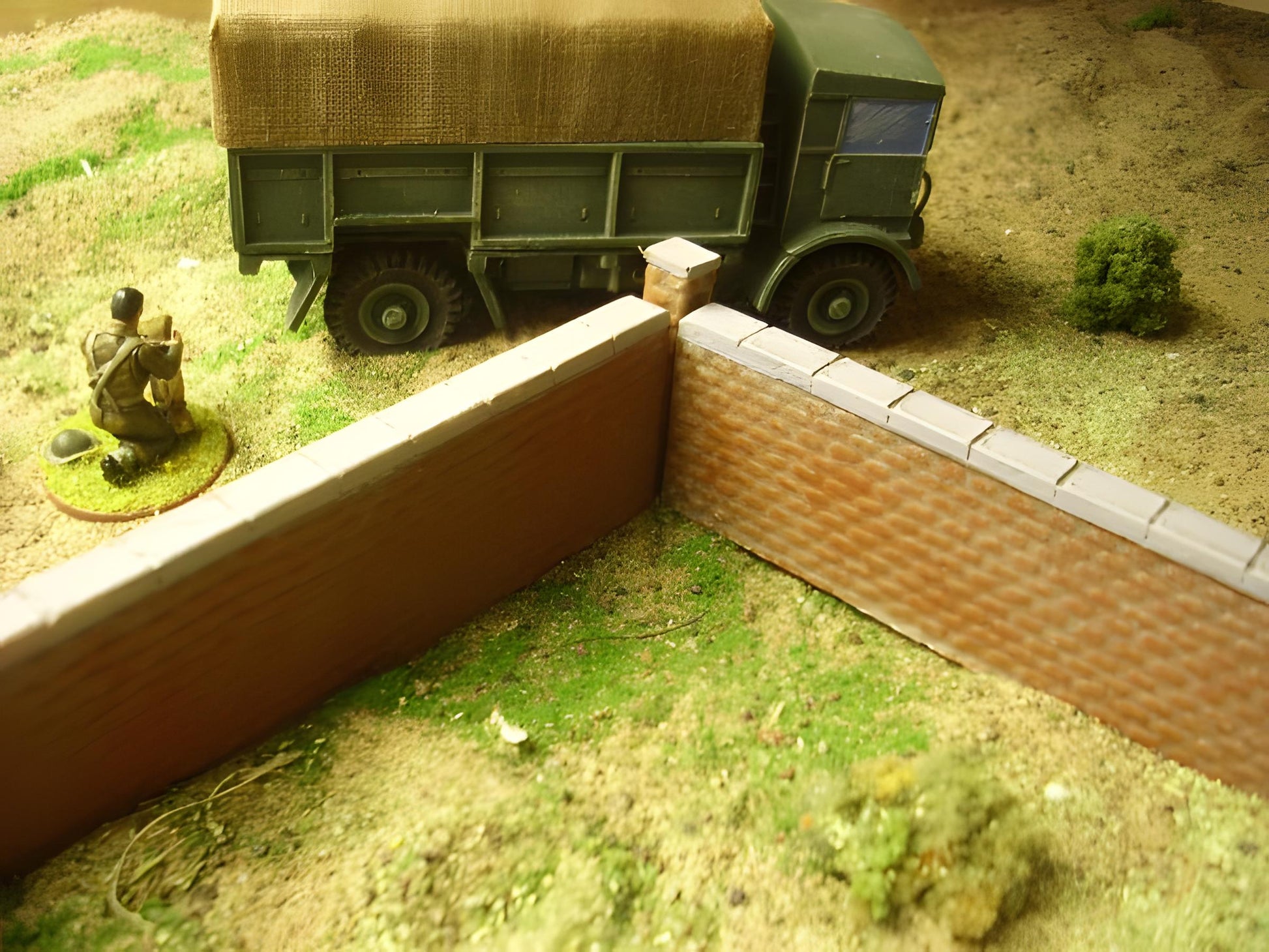 1:56 scale for 28 mm wargames. Representing 6 ft high brick walls this set comprises of the 3 straight sections a gate section and 4 corner posts. The walls can be cut to length and bent to form curves by the application of heat.