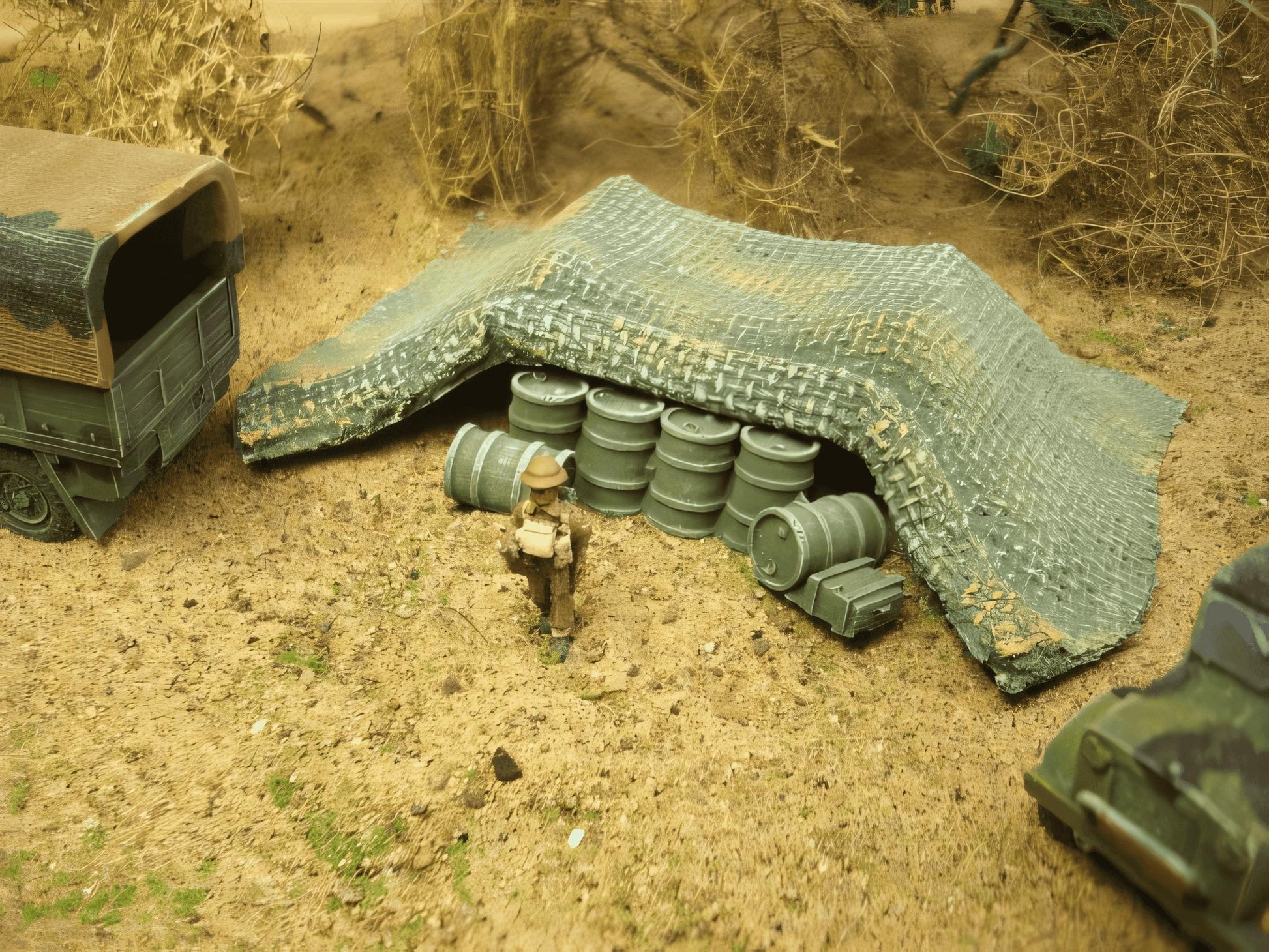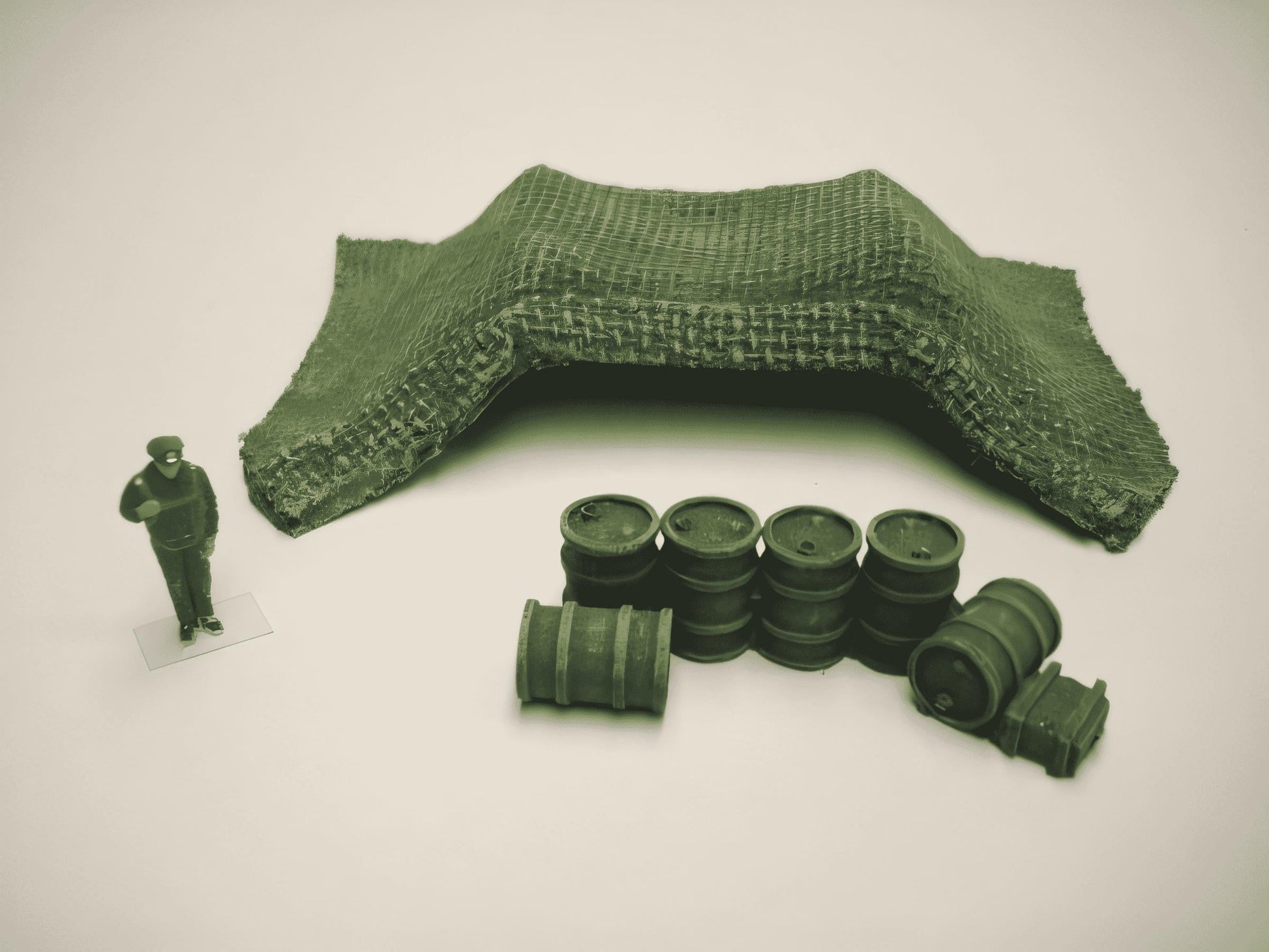 1:72 for OO or 20mm, 40 gal oil drums under a camouflage net, 2 piece hollow casting with detached strip of oil drums.