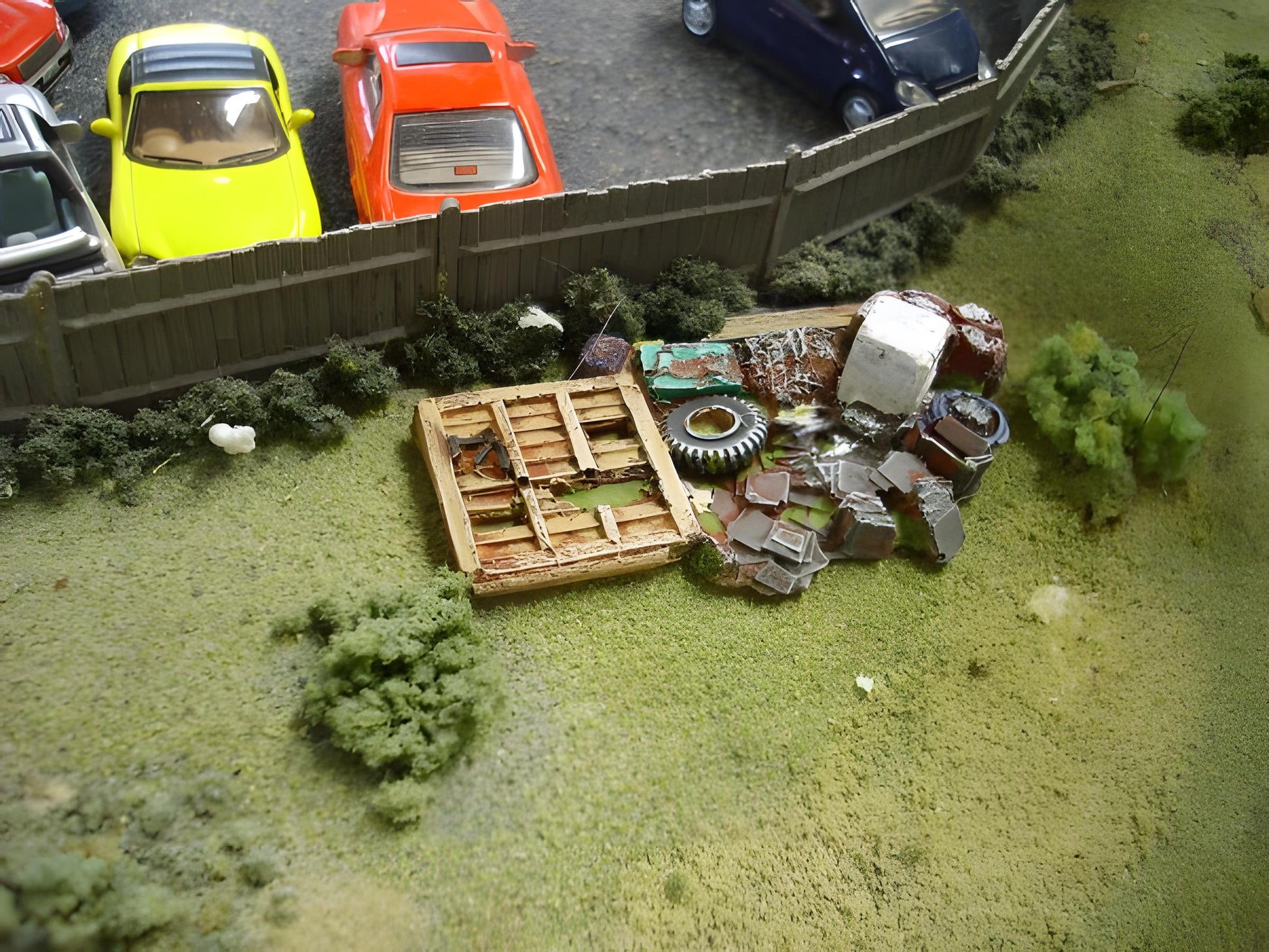 This 1:76 scale fly-tipped rubbish assortment impeccably captures the essence of discarded household items, featuring a detailed washing machine and fence panel among the refuse.