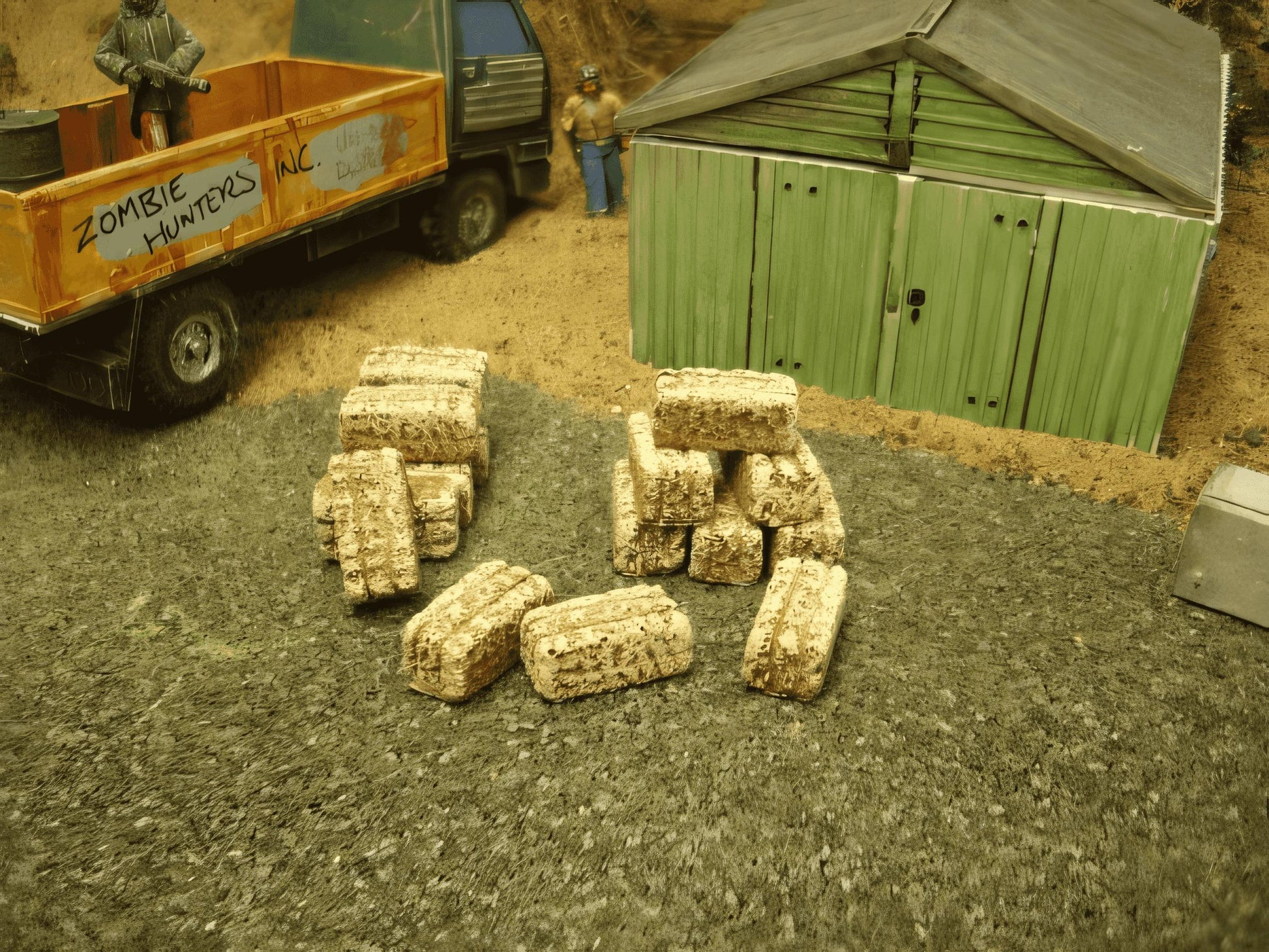 Text Description: 1:56 scale for 28 mm wargames. Pack of 16 straw or hay bales for barricades etc.