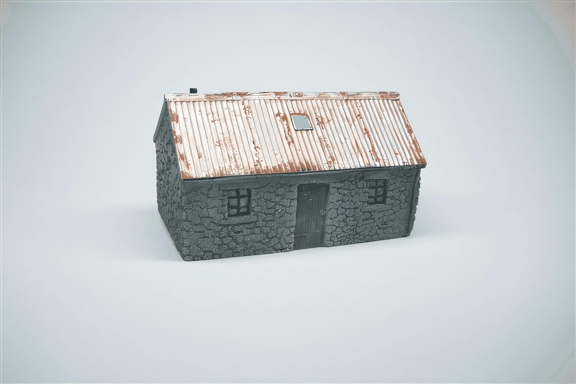 A single piece hollow resin casting of a stone-built cottage with a tin roof of a type found all over Scotland. From mountainside to fishing village, many are now used as mountaineering and hill walking bothys.