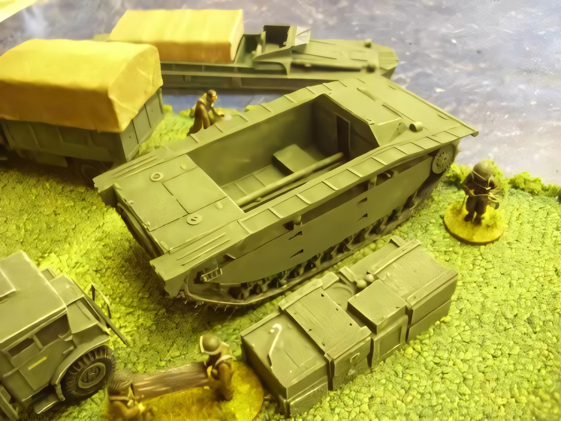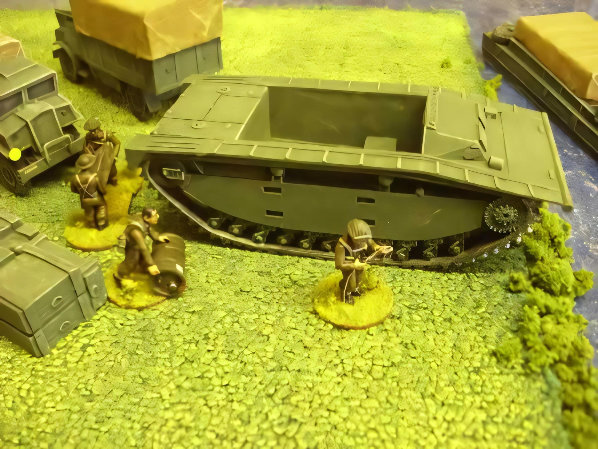 One of the earlier versions of the famous amphibious troop carriers used in the Pacific in 1:56 scale for 28mm. This model comes fully assembled and only needs painted to your desired scheme. Mine are shown in the action photos preparing to cross the Rhine in 45.