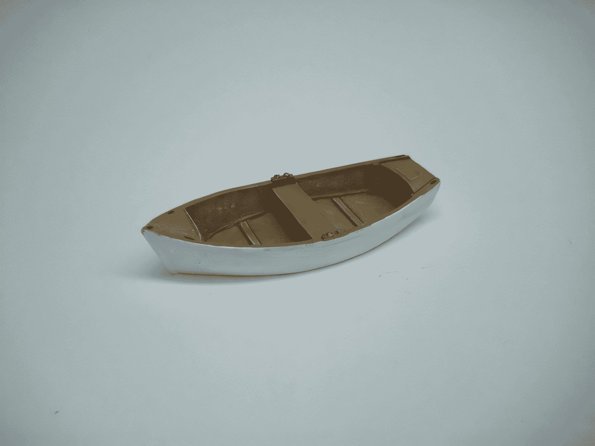 A small waterline model of a fibreglass hull rowing boat.