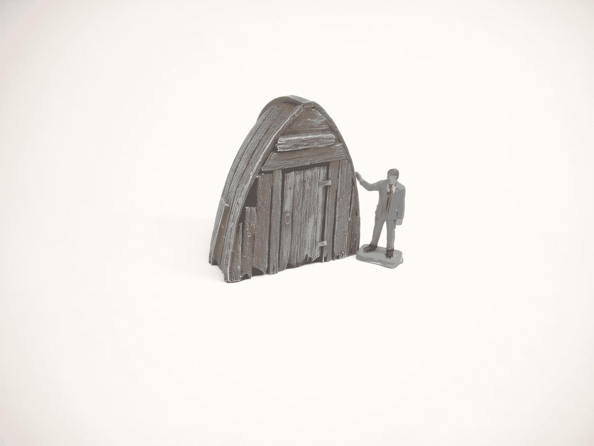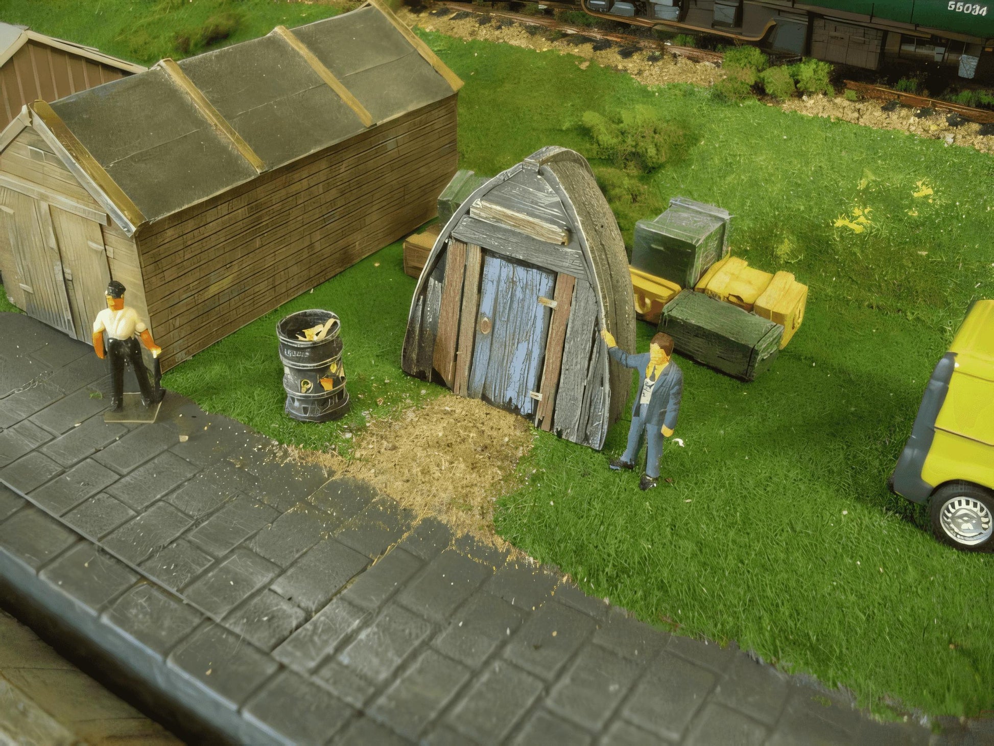 4mm/1:76 scale for OO Railways or 20mm. A wooden shed made from the front end of an old boat hull.
