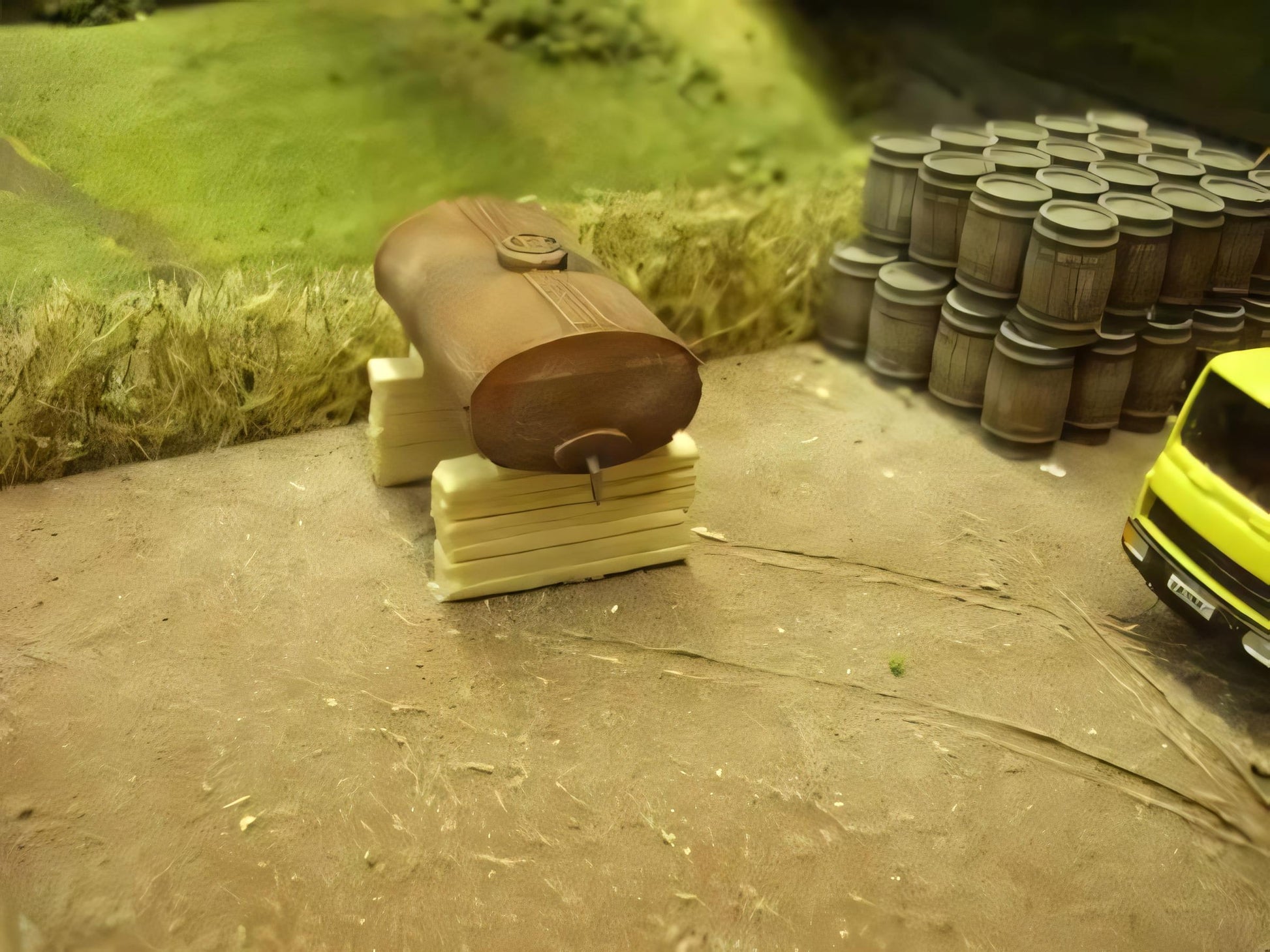 An industrial oil storage tank sitting on baulks of timber, suitable for all sorts of working yard scenes on your layout.