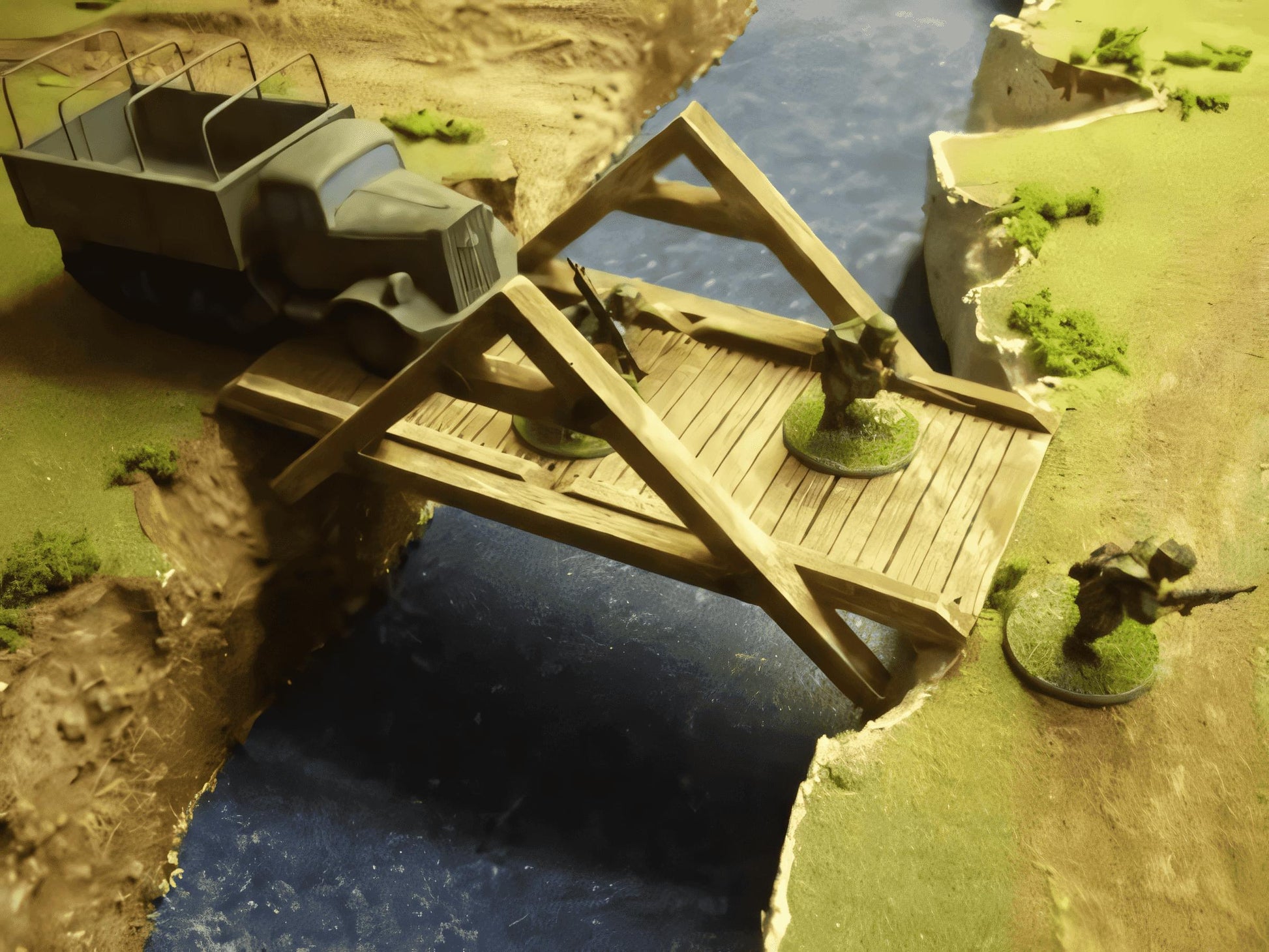 Wooden emergency bridge. Simple 5 piece kit. Designed to be assembled without glue so you can take it apart to represent a blown bridge. The 'A' frames slot into holes in the ramp bases and the road deck rests in between. Wire inserts are cast into the 'A' frame to support the thin resin structure better. Suitable for 1:56 figures. Great for Eastern front scenarios. Ideal for many different historical periods. Bridge will span an 80mm wide obstacle. Overall length from ramp to ramp is 280mm. Width at base of ramp is 100mm.