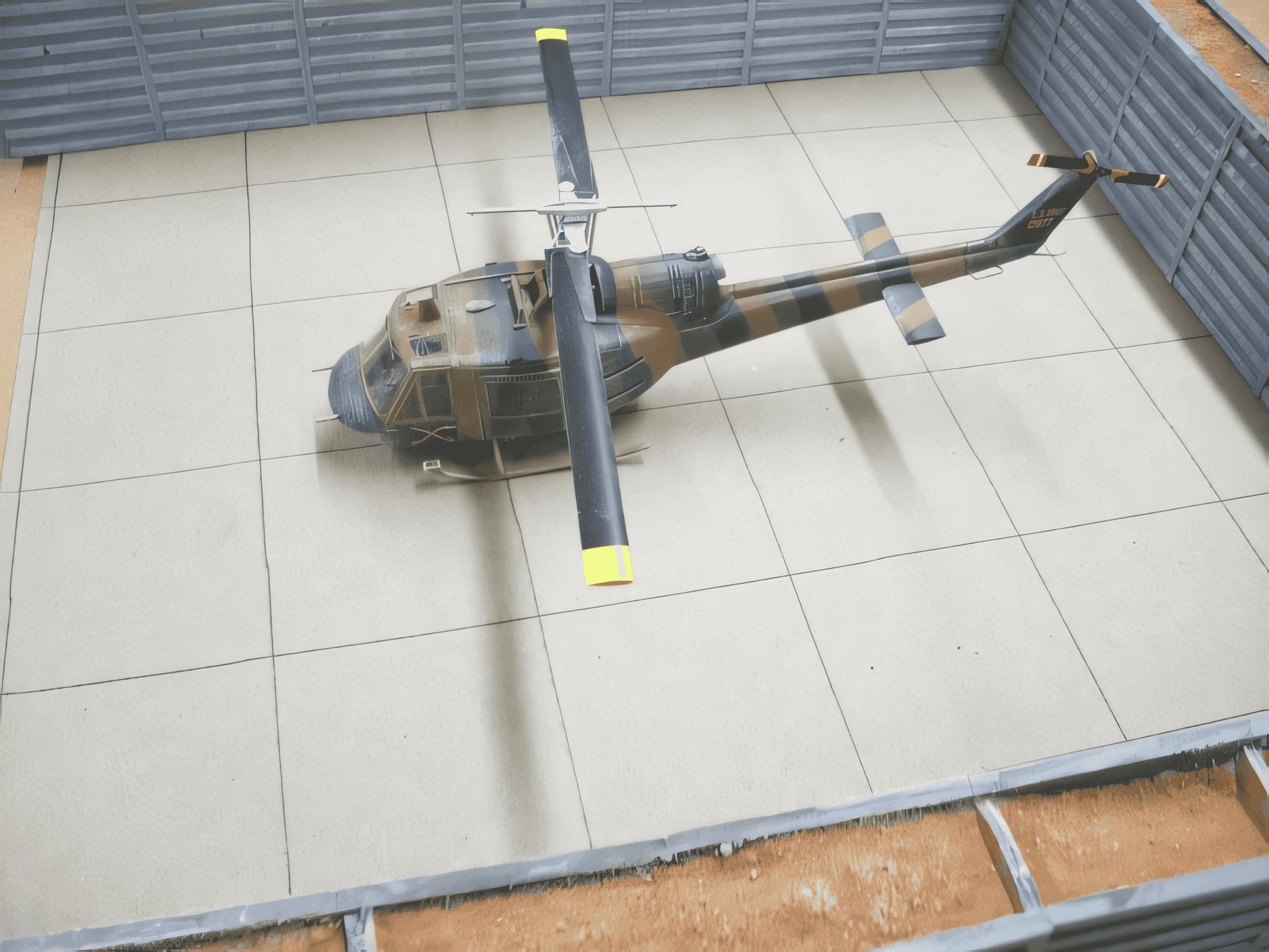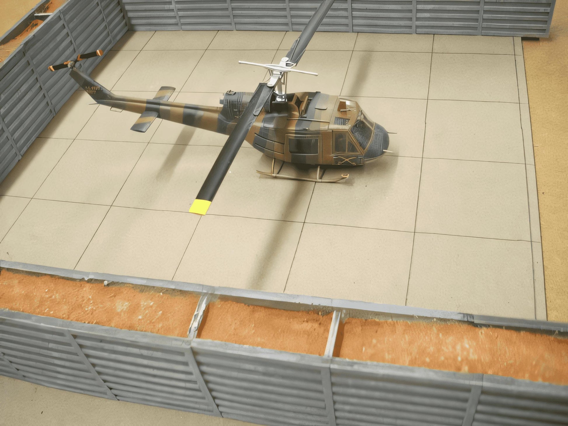A 1:72 scale aircraft blast wall, historically reflective of those used to shelter aircraft as seen during the Vietnam war. Each wall consists of 16 finely cast panels. 3 of these walls makes up a 'U' shape blast pen.