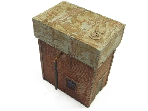 A resin cast model of a brick built tower with a metal water tank on top. It comprises 2 hollow cast sections. Tank and Building + pipe and hose. No kit building work required.