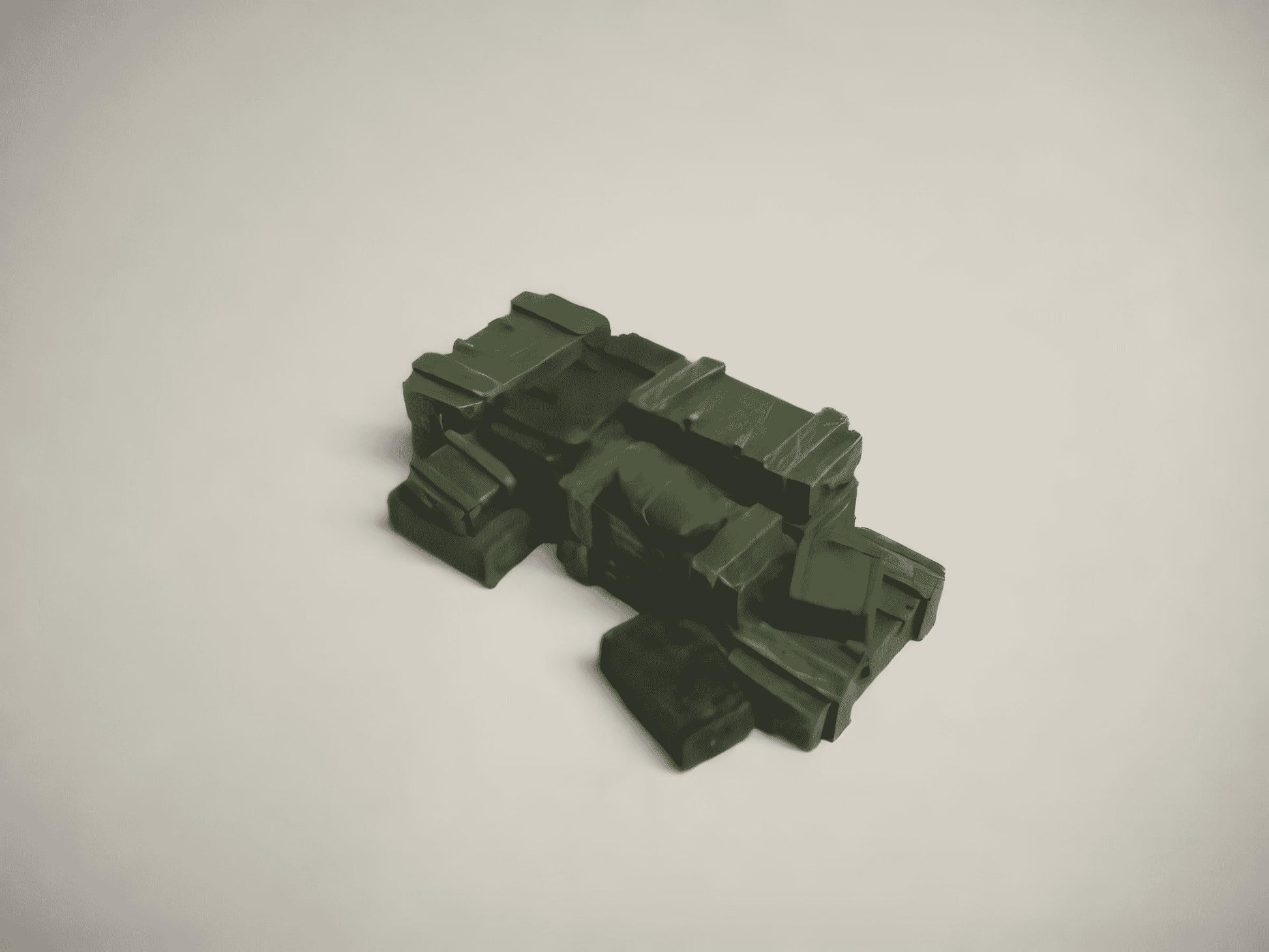 A one piece solid casting of a stack of weapon boxes for use as truck loads or scene setting.